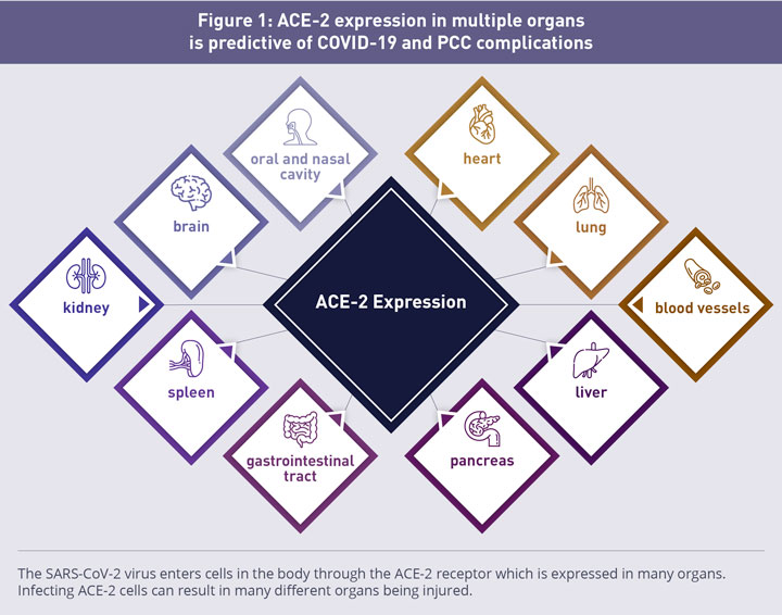 SARS-CoV-2, the causative agent of COVID-19, belongs to the Beta Coronaviridae family, which includes severe acute respiratory syndrome coronavirus (SARS-CoV-1) and the Middle East respiratory syndrome coronavirus (MERS-CoV), which are responsible for the 2002-04 SARS epidemic and MERS outbreaks, respectively. COVID-19 was first reported in China at the end of 2019 with hospitalized individuals presenting with fever, cough, muscle pains and abnormal chest tomography; nearly 30 percent of hospitalized patients developed acute respiratory distress syndrome (ARDS). Fortunately, not all cases of the illness require hospitalization and in most cases the disease presents with mild to moderate symptoms with good recovery. Nonetheless, a significant number of individuals experience severe illness and death, especially older adults and those with pre-existing co-morbidities. Common symptoms of COVID-19 are cough, shortness of breath, fever, fatigue, muscle aches and gastrointgtestinal issues. Severe disease features more serious symptoms and complications like ARDS, cardiac inflammation and injury, stroke, and kidney and neurologic disease. While predominantly an airborne respiratory disease, acute COVID-19 can affect many systems and organs, including the nervous, cardiovascular, gastrointestinal, musculoskeletal and endocrine systems. The wide range of COVID-19 and PCC symptoms and organs affected are summarized in Table 1 below.