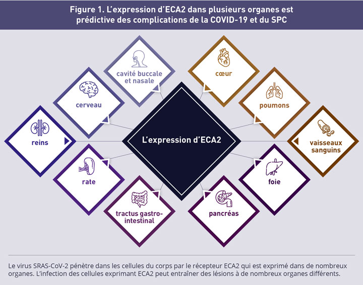 ECA2 fait partie intégrante du système rénine-angiotensine-aldostérone (SRAA), qui est le principal régulateur de la pression artérielle et de l’homéostasie vasculaire. ECA2 a des effets protecteurs, car elle dégrade l’angiotensine II, la principale hormone vasoconstrictrice pro-inflammatoire du SRAA. De ce fait, ECA2 contribue à abaisser la pression artérielle et à prévenir l’inflammation vasculaire et la fibrose des organes. ECA2 clive d’autres substrats physiologiques, y compris la bradykinine, une molécule qui joue un rôle important dans l’inflammation, et l’apeline, un régulateur important des systèmes endocrinien et cardiovasculaire. Indépendamment de son activité enzymatique, ECA2 régule également d’autres processus cellulaires, comme le transport des acides aminés dans les intestins. En abaissant le taux d’ECA2 à la surface des cellules, le SRAS-CoV-2 nuit à des voies physiologiques importantes dans les cellules cibles. Cela a à son tour pour effet de perturber certaines interactions cellule-cellule, l’équilibre hormonal et la concentration de l’oxygène et de nutriments dans de nombreux organes. Il est important de connaître le rôle physiologique de l’ECA2 et sa distribution cellulaire pour comprendre la pathogenèse du SRAS-CoV-2 dans la phase aiguë et les mécanismes possibles du syndrome post-COVID-19.