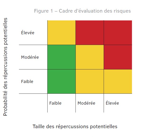 Une façon d'évaluer rapidement le profil de risque de votre projet est d'utiliser le tableau à la page 5, puis de comparer vos résultats avec la grille colorée - Cadre d'évaluation des risques (Figure 1) pour déterminer les prochaines étapes.